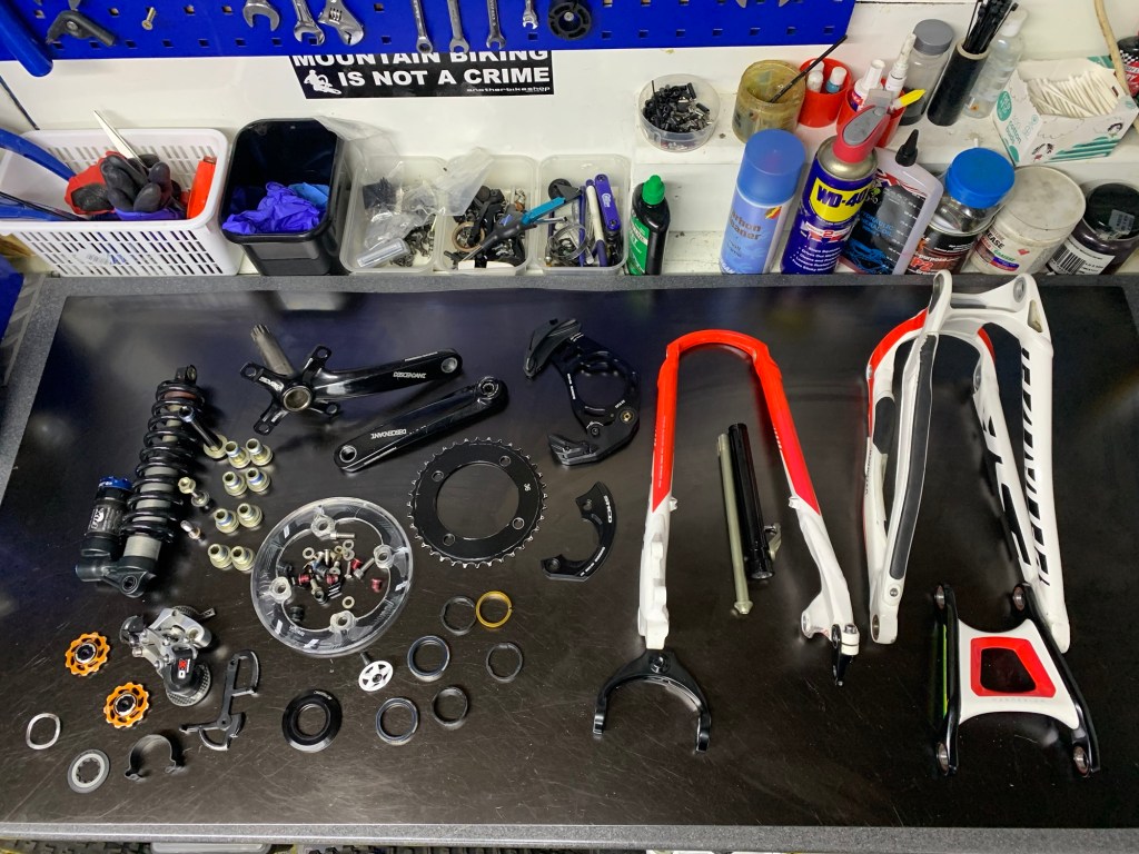 Complete strip down of the whole bike, pivots, headset, wheels, bottom bracket and drive-chain. (Chainrings, cassette, chain, front/rear derailleur degreased) Everything is cleaned, rebuilt-greased up, serviced and polished to make your bike shine.